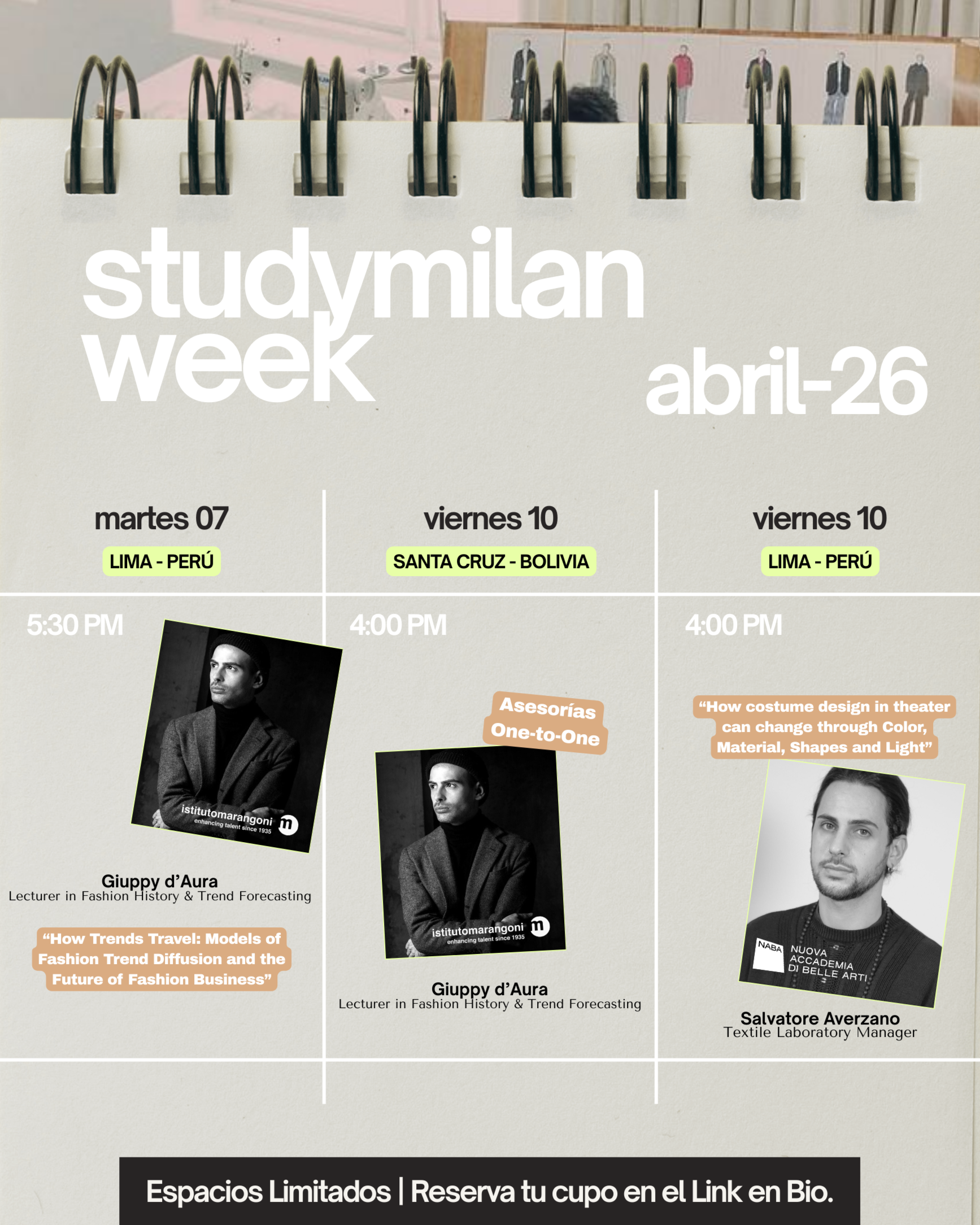 Profesores de Istituto Marangoni y NABA compartirán presentaciones y encuentros exclusivos en el Studymilan Hub en nuestras dos sedes: Lima, Perú y Santa Cruz, Bolivia.